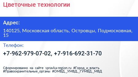 Цветочные технологии по адресу 140125, Московская область, Островцы, Подмосковная, 15 в дальнейшем Организация, размещена в следующих категориях: