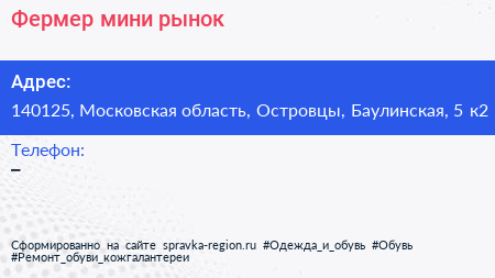 Фермер, мини-рынок по адресу 140125, Московская область, Островцы, Баулинская, 5 к2 в дальнейшем Организация, размещена в следующих категориях: