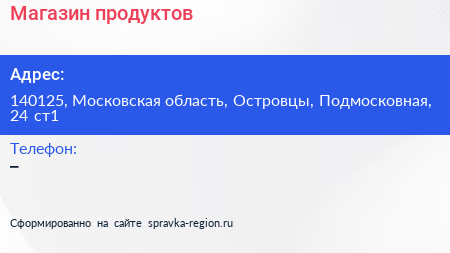 Магазин продуктов по адресу 140125, Московская область, Островцы, Подмосковная, 24 ст1 в дальнейшем Организация, размещена в следующих категориях:
