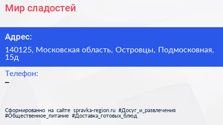 Мир сладостей по адресу 140125, Московская область, Островцы, Подмосковная, 15д в дальнейшем Организация, размещена в следующих категориях: