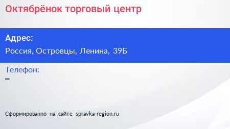 Октябрёнок, торговый центр по адресу Торговый комплекс "Октябрёнок", 39Б, улица Ленина, Михнево, Октябрьский, городской округ Люберцы, Московская область, Центральный федеральный округ, 140060, Россия в дальнейшем Организация, размещена в следующих категориях: