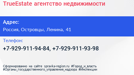 TrueEstate, агентство недвижимости по адресу Офис продаж "Новые Островцы", 41, улица Ленина, Михнево, Октябрьский, городской округ Люберцы, Московская область, Центральный федеральный округ, 140060, Россия в дальнейшем Организация, размещена в следующих категориях:
