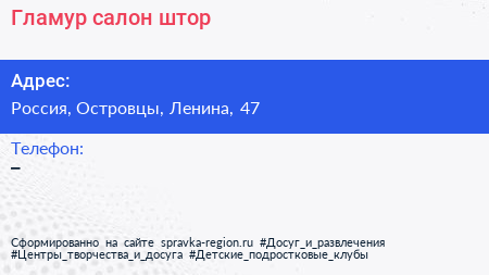 Гламур, салон штор по адресу Торговый комплекс "Текстиль-Профи", 47, улица Ленина, Михнево, Октябрьский, городской округ Люберцы, Московская область, Центральный федеральный округ, 140060, Россия в дальнейшем Организация, размещена в следующих категориях:
