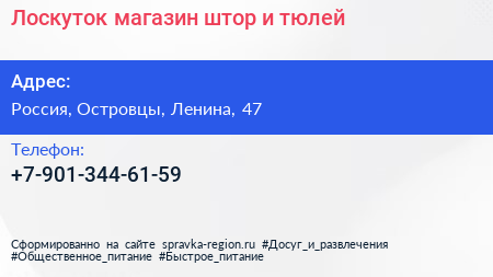 Лоскуток, магазин штор и тюлей по адресу Торговый комплекс "Текстиль-Профи", 47, улица Ленина, Михнево, Октябрьский, городской округ Люберцы, Московская область, Центральный федеральный округ, 140060, Россия в дальнейшем Организация, размещена в следующих категориях: