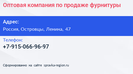Оптовая компания по продаже фурнитуры по адресу Торговый комплекс "Текстиль-Профи", 47, улица Ленина, Михнево, Октябрьский, городской округ Люберцы, Московская область, Центральный федеральный округ, 140060, Россия в дальнейшем Организация, размещена в следующих категориях: