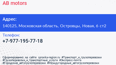 АВ motors по адресу 140125, Московская область, Островцы, Новая, 6 ст2 в дальнейшем Организация, размещена в следующих категориях: