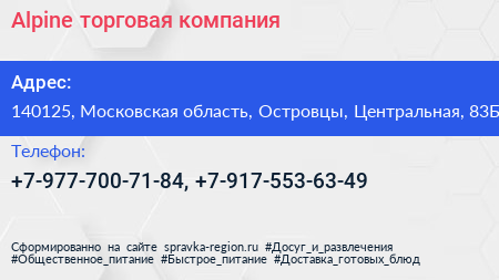 Alpine, торговая компания по адресу 140125, Московская область, Островцы, Центральная, 83Б в дальнейшем Организация, размещена в следующих категориях: