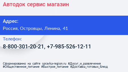 Автодок-сервис, магазин по адресу Офис продаж "Новые Островцы", 41, улица Ленина, Новые Островцы, Октябрьский, городской округ Люберцы, Московская область, Центральный федеральный округ, 140125, Россия в дальнейшем Организация, размещена в следующих категориях: