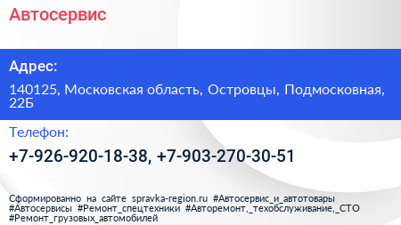 Автосервис по адресу 140125, Московская область, Островцы, Подмосковная, 22Б в дальнейшем Организация, размещена в следующих категориях: