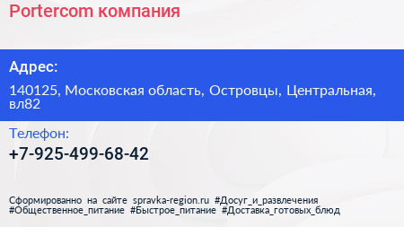 Portercom, компания по адресу 140125, Московская область, Островцы, Центральная, вл82 в дальнейшем Организация, размещена в следующих категориях: