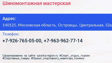 Шиномонтажная мастерская по адресу 140125, Московская область, Островцы, Центральная, 52а в дальнейшем Организация, размещена в следующих категориях: