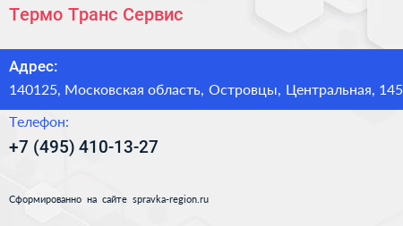 Термо Транс Сервис по адресу 140125, Московская область, Островцы, Центральная, 145 в дальнейшем Организация, размещена в следующих категориях: