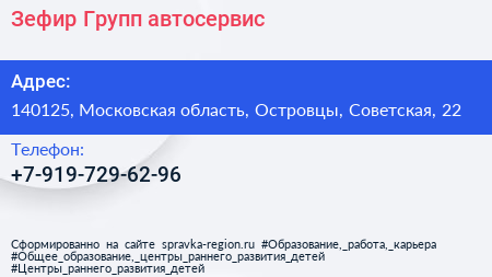 Зефир-Групп, автосервис по адресу 140125, Московская область, Островцы, Советская, 22 в дальнейшем Организация, размещена в следующих категориях: