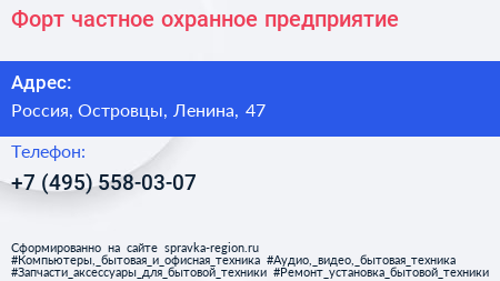 Форт, частное охранное предприятие по адресу Торговый комплекс "Текстиль-Профи", 47, улица Ленина, Михнево, Октябрьский, городской округ Люберцы, Московская область, Центральный федеральный округ, 140060, Россия в дальнейшем Организация, размещена в следующих категориях: