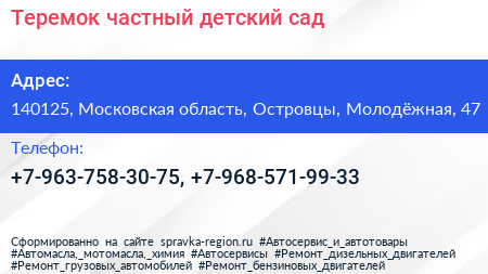 Теремок, частный детский сад по адресу 140125, Московская область, Островцы, Молодёжная, 47 в дальнейшем Организация, размещена в следующих категориях: