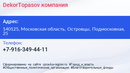 DekorTopasov, компания по адресу 140125, Московская область, Островцы, Подмосковная, 25 в дальнейшем Организация, размещена в следующих категориях:
