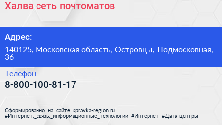Халва, сеть почтоматов по адресу 140125, Московская область, Островцы, Подмосковная, 36 в дальнейшем Организация, размещена в следующих категориях: