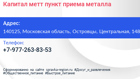 Капитал метт, пункт приема металла по адресу 140125, Московская область, Островцы, Центральная, 148 в дальнейшем Организация, размещена в следующих категориях: