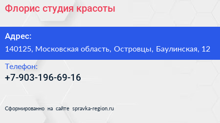 Флорис, студия красоты по адресу 140125, Московская область, Островцы, Баулинская, 12 в дальнейшем Организация, размещена в следующих категориях: