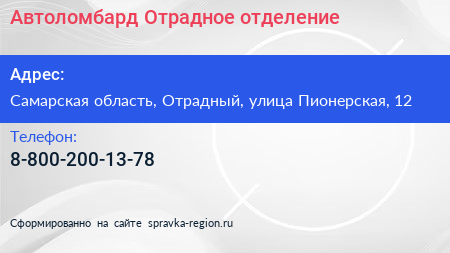 Автоломбард, Отрадное отделение по адресу Самарская область, Отрадный, улица Пионерская, 12 в дальнейшем Организация, размещена в следующих категориях: