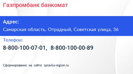 Газпромбанк, банкомат по адресу Самарская область, Отрадный, Советская улица, 36 в дальнейшем Организация, размещена в следующих категориях: