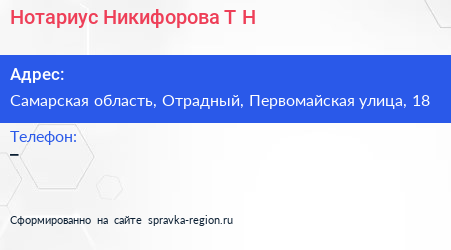 Нотариус Никифорова Т.Н. по адресу Самарская область, Отрадный, Первомайская улица, 18 в дальнейшем Организация, размещена в следующих категориях: