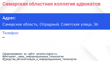 Самарская областная коллегия адвокатов по адресу Самарская область, Отрадный, Советская улица, 36 в дальнейшем Организация, размещена в следующих категориях:
