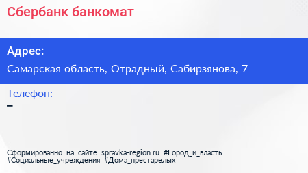 Сбербанк, банкомат по адресу Самарская область, Отрадный, Сабирзянова, 7 в дальнейшем Организация, размещена в следующих категориях: