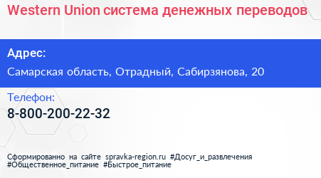 Western Union, система денежных переводов по адресу Самарская область, Отрадный, Сабирзянова, 20 в дальнейшем Организация, размещена в следующих категориях: