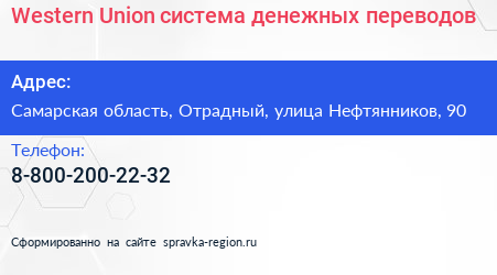 Western Union, система денежных переводов по адресу Самарская область, Отрадный, улица Нефтянников, 90 в дальнейшем Организация, размещена в следующих категориях: