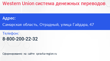 Western Union, система денежных переводов по адресу Самарская область, Отрадный, улица Гайдара, 47 в дальнейшем Организация, размещена в следующих категориях: