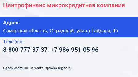 Центрофинанс, микрокредитная компания по адресу Самарская область, Отрадный, улица Гайдара, 45 в дальнейшем Организация, размещена в следующих категориях: