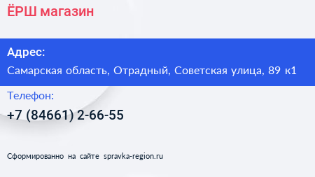 ЁРШ, магазин по адресу Самарская область, Отрадный, Советская улица, 89 к1 в дальнейшем Организация, размещена в следующих категориях: