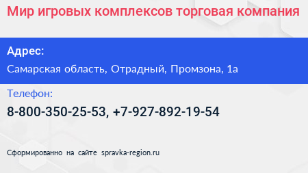 Мир игровых комплексов, торговая компания по адресу Самарская область, Отрадный, Промзона, 1а в дальнейшем Организация, размещена в следующих категориях: