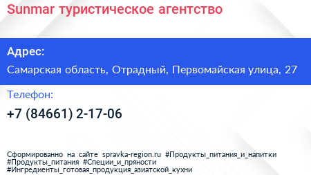 Sunmar, туристическое агентство по адресу Самарская область, Отрадный, Первомайская улица, 27 в дальнейшем Организация, размещена в следующих категориях: