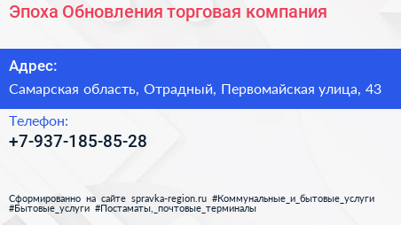 Эпоха Обновления, торговая компания по адресу Самарская область, Отрадный, Первомайская улица, 43 в дальнейшем Организация, размещена в следующих категориях:
