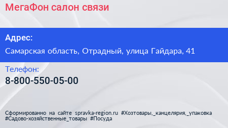 МегаФон, салон связи по адресу Самарская область, Отрадный, улица Гайдара, 41 в дальнейшем Организация, размещена в следующих категориях: