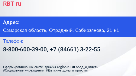 RBT.ru по адресу Самарская область, Отрадный, Сабирзянова, 21 к1 в дальнейшем Организация, размещена в следующих категориях: