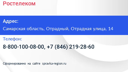 Ростелеком по адресу Самарская область, Отрадный, Отрадная улица, 14 в дальнейшем Организация, размещена в следующих категориях:
