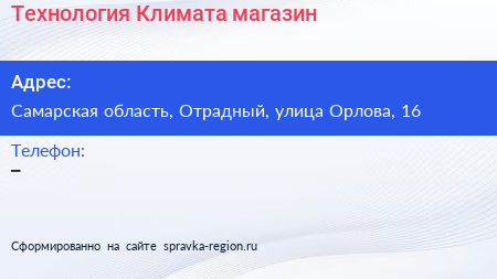 Технология Климата, магазин по адресу Самарская область, Отрадный, улица Орлова, 16 в дальнейшем Организация, размещена в следующих категориях:
