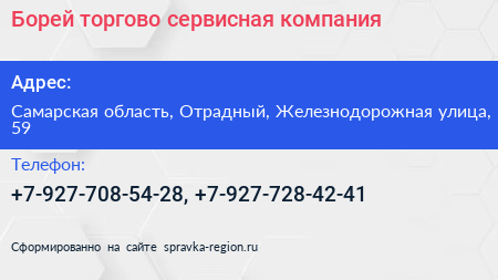 Борей, торгово-сервисная компания по адресу Самарская область, Отрадный, Железнодорожная улица, 59 в дальнейшем Организация, размещена в следующих категориях: