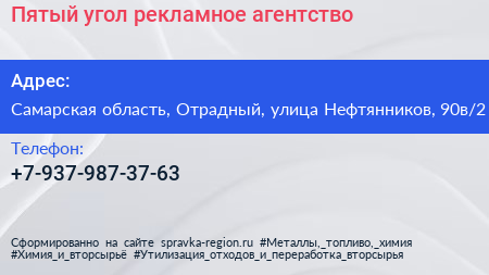 Пятый угол, рекламное агентство по адресу Самарская область, Отрадный, улица Нефтянников, 90в/2 в дальнейшем Организация, размещена в следующих категориях: