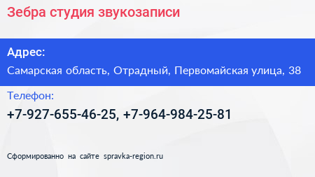 Зебра, студия звукозаписи по адресу Самарская область, Отрадный, Первомайская улица, 38 в дальнейшем Организация, размещена в следующих категориях: