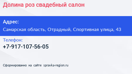 Долина роз, свадебный салон по адресу Самарская область, Отрадный, Спортивная улица, 43 в дальнейшем Организация, размещена в следующих категориях:
