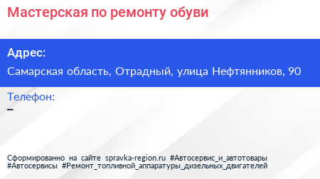 Мастерская по ремонту обуви по адресу Самарская область, Отрадный, улица Нефтянников, 90 в дальнейшем Организация, размещена в следующих категориях: