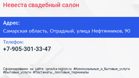 Невеста, свадебный салон по адресу Самарская область, Отрадный, улица Нефтянников, 90 в дальнейшем Организация, размещена в следующих категориях: