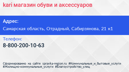 kari, магазин обуви и аксессуаров по адресу Самарская область, Отрадный, Сабирзянова, 21 к1 в дальнейшем Организация, размещена в следующих категориях: