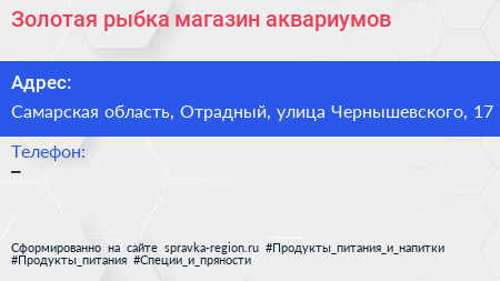 Золотая рыбка, магазин аквариумов по адресу Самарская область, Отрадный, улица Чернышевского, 17 в дальнейшем Организация, размещена в следующих категориях: