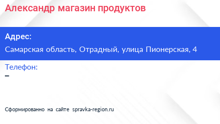 Александр, магазин продуктов по адресу Самарская область, Отрадный, улица Пионерская, 4 в дальнейшем Организация, размещена в следующих категориях: