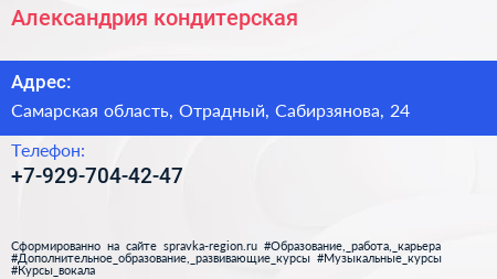 Александрия, кондитерская по адресу Самарская область, Отрадный, Сабирзянова, 24 в дальнейшем Организация, размещена в следующих категориях: